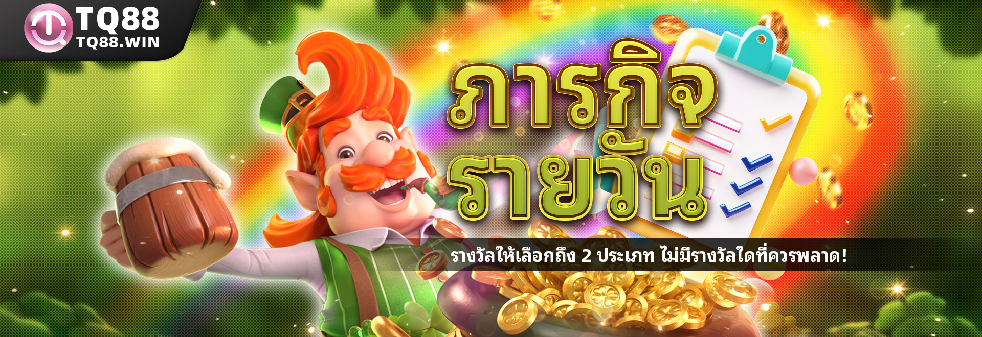 ภารกิจรายวัน TQ88 จัดเต็มโบนัส 2 ต่อ! เลือกรับรางวัลได้ตามสไตล์คุณ ไม่ว่าจะเป็นโบนัสเงินฝากรายวัน หรือโบนัสคืนยอดเสียจากเมื่อวาน แจกสูงสุดหลักพันบาท พร้อมทำเทิร์นโอเวอร์ต่ำ เริ่มต้นความคุ้มค่าได้ทุกวัน ห้ามพลาด!